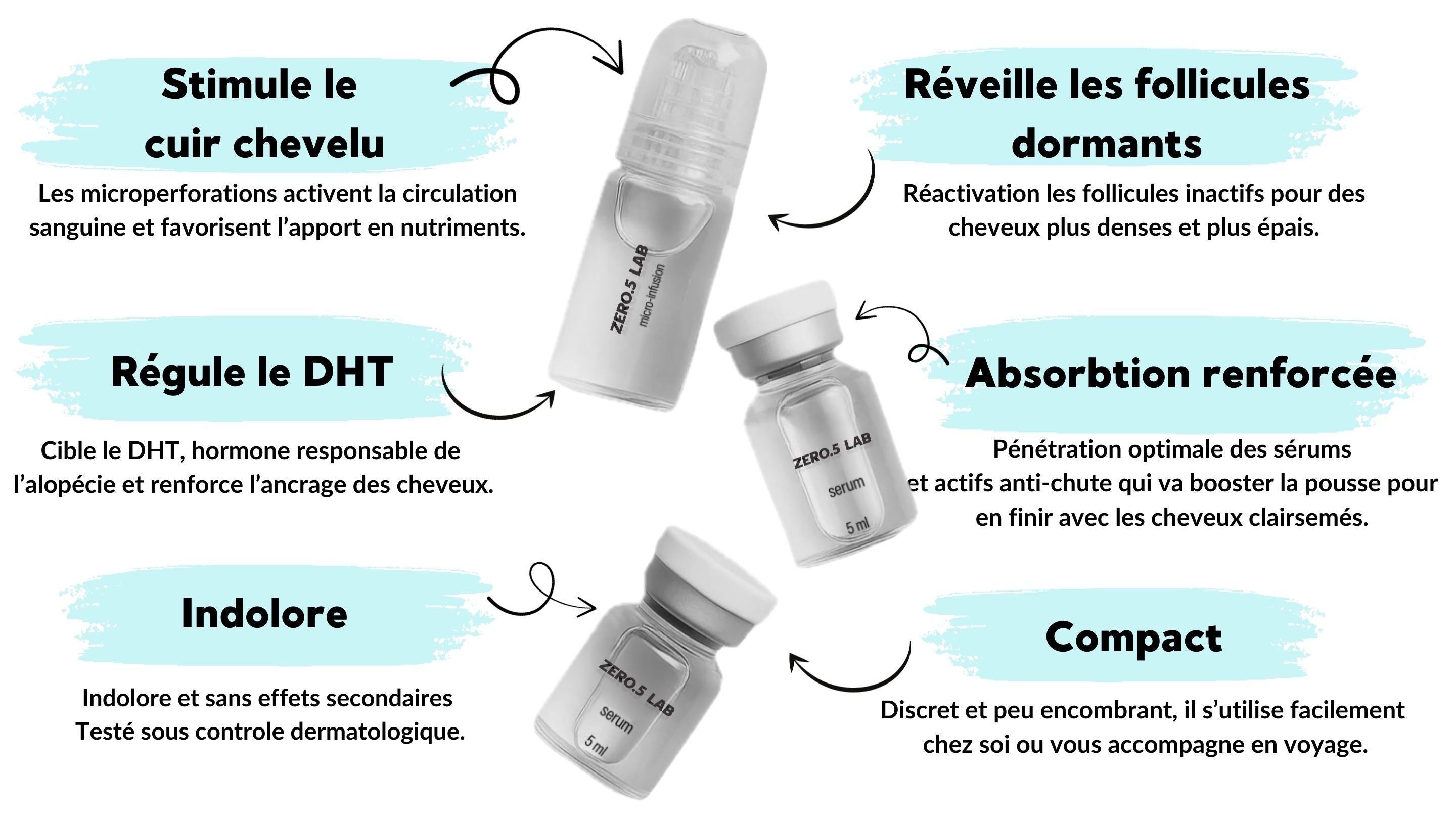 ZERO.5 LAB utilise la technologie de micro-infusion en or 24K pour créer de micro-canaux qui permettent aux actifs de pénétrer directement à la racine, là où la croissance se joue.